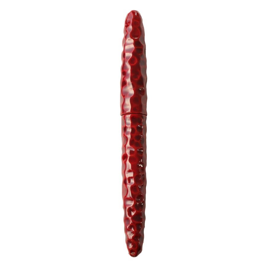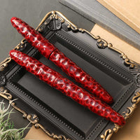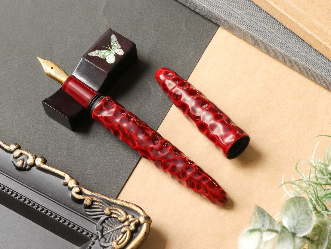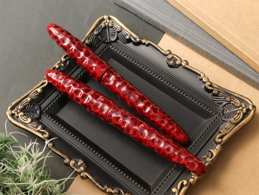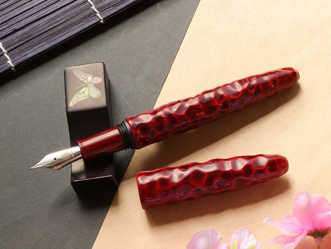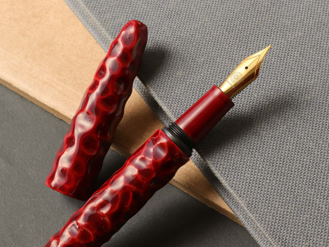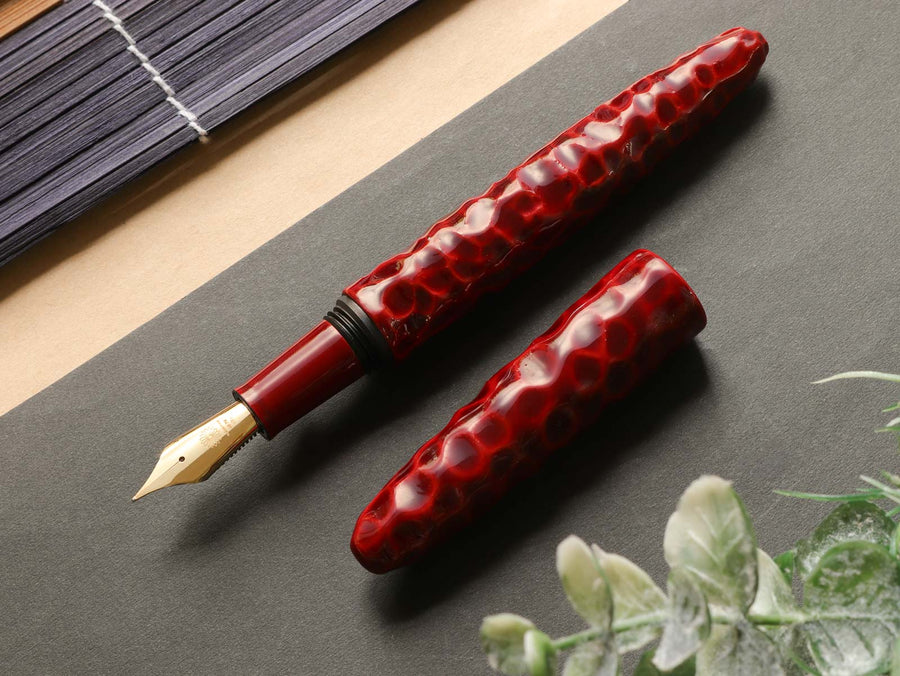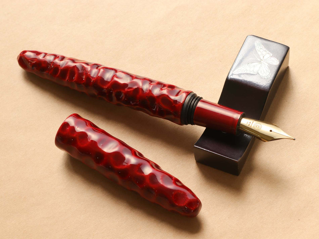 亀甲塗は、軸に亀の甲羅を模した亀甲彫りを施し、その上から漆を塗り重ねて仕上げています。中塗りの上に重ねた上塗りは経年変化で透明感を増し、徐々に中塗りの色漆が見えるようになってきます。使い込むほどに味わいのある魅力的な万年筆です。