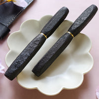研ぎ出し変わり塗技法のひとつ。仕掛技法を用い黒漆で文様を描き重ね、更に全体に黒漆を塗り、表面が濡れている状態で炭粉を蒔いて研ぎ出すと艶消しの仕上がりになります。梨地のマットブラックに浮かび上がる艶ややかな漆黒の模様はモダンでありシックな表情を魅せます。